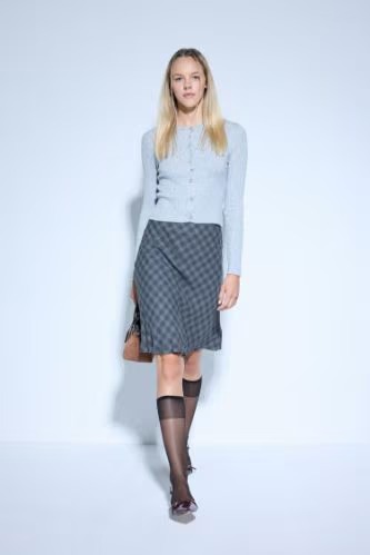 Kareli midi etek, yumuşak ve hafif viskon dokusuyla yürüyüşlerde crêpe bir etki yaratır.
