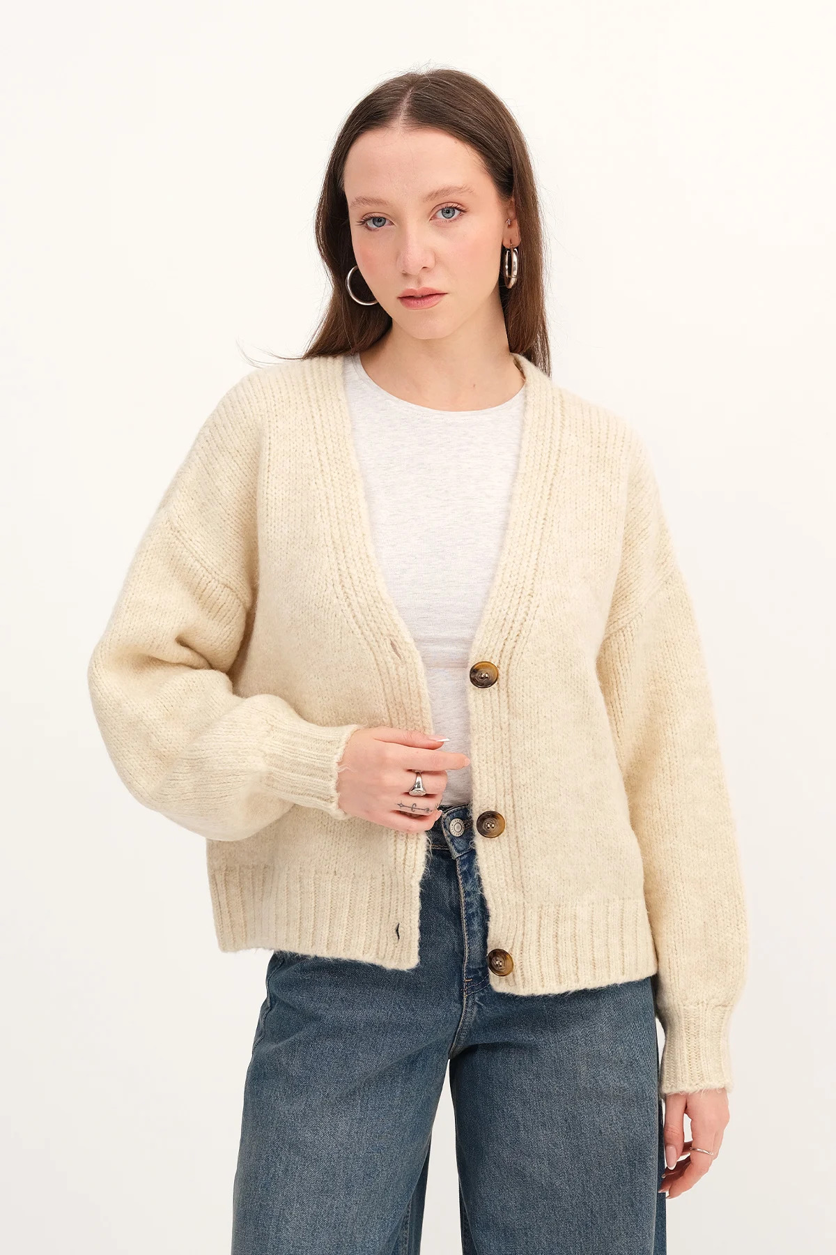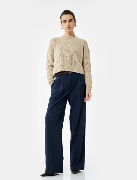 Bu ekru bisiklet yaka triko kazak, sadeliği ve yumuşak dokusuyla hemen her parçayla rahatça eşleşir.