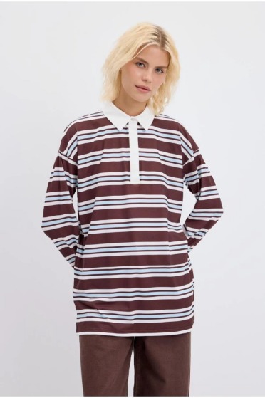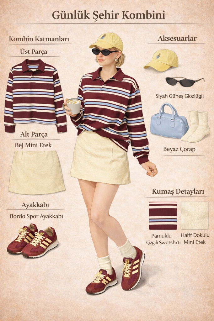 Retro çizgili sweatshirt ve mini etek ikilisi bu bahar sezonun en rahat ama en stil sahibi kombinlerinden. Şapka ve spor ayakkabıyla tamamlanan bu görünüm şehirde kahve molaları için ideal.🩵