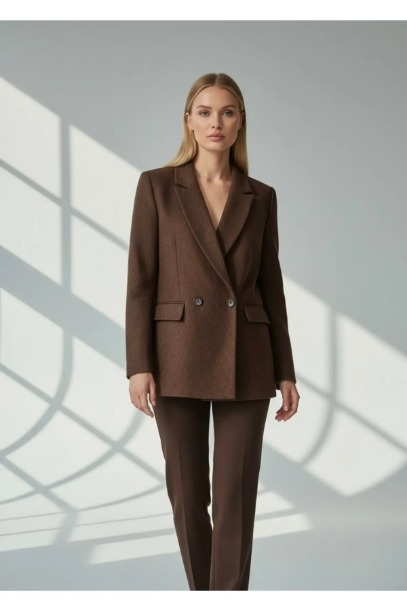 Kahverengi kaşe kruvaze oversize blazer ceket