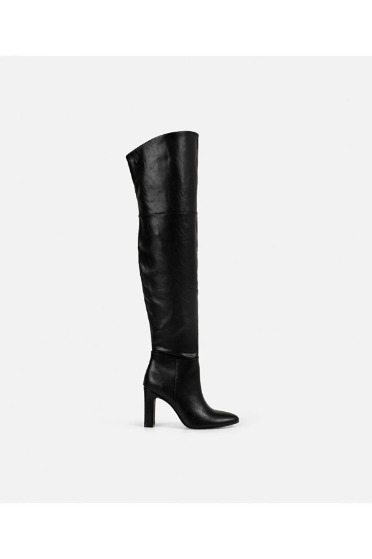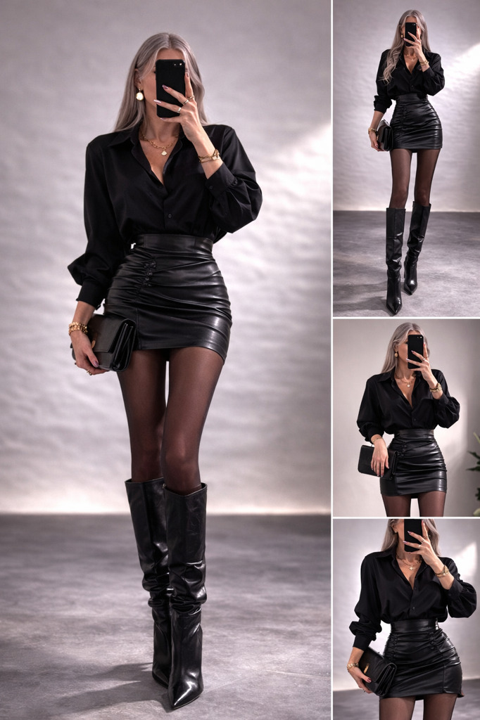 Akışkan gömlek ve vücuda oturan deri mini arasındaki kontrast, modern güç silüetini tanımlıyor. Drapeli bel detayı feminen vurguyu artırırken, diz altı çizmeler görünümü keskinleştiriyor.