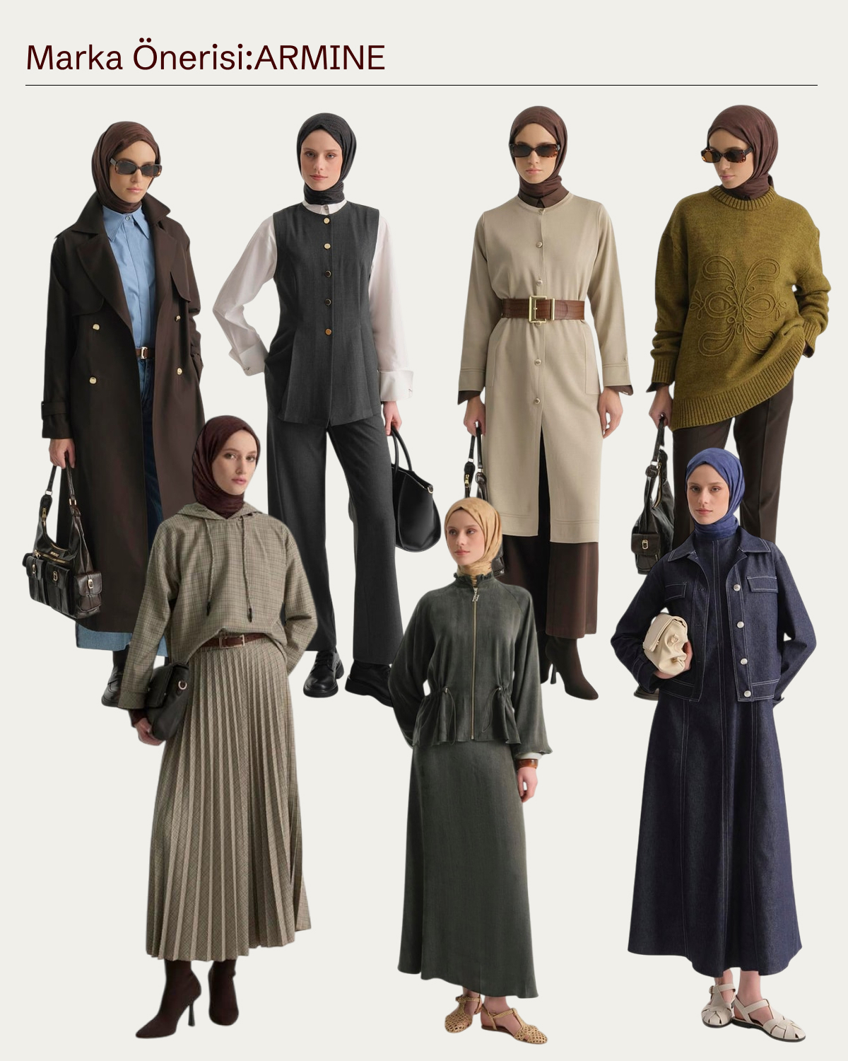 Köklü bir stil mirasını sofistike bir bakış açısıyla bugüne taşıyan Armine, tesettür modasında zamansız şıklığın temsilcilerinden. Net kesimler, güçlü dış giyim tasarımları ve kusursuz duran takımlar markanın imza parçaları arasında. Özellikle eşarp ve şal koleksiyonlarıyla kombinlerin en zarif tamamlayıcısını sunuyor. Daha klasik, daha oturmuş ve her ortamda kendini iyi hissettiren bir stil kurmak isteyenler için vazgeçilmez bir marka.