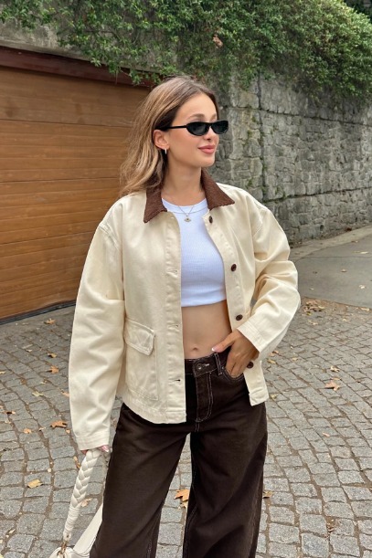 Ekru yaka detaylı denim gömlek ceket