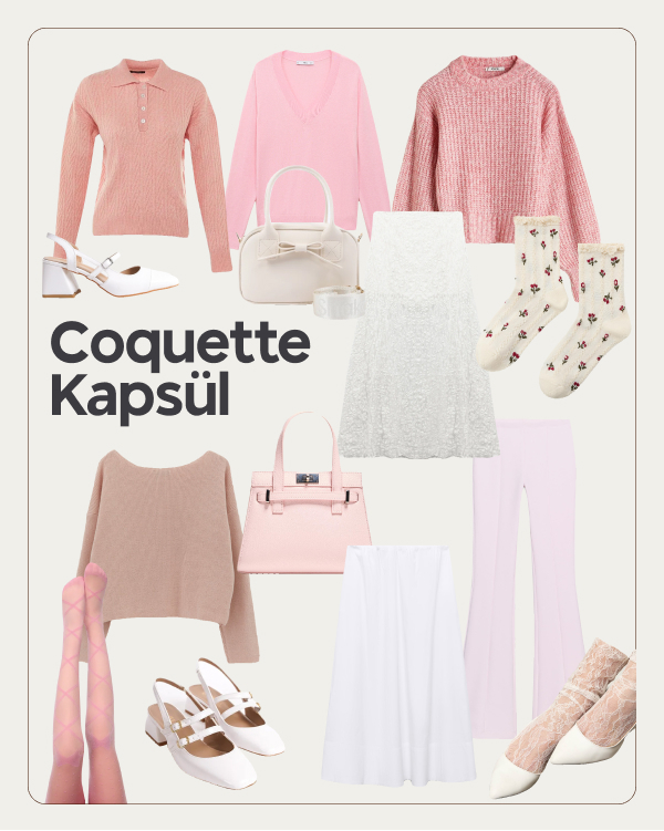 Coquette kapsül, romantik stilin sadeleşmiş hâli. Yumuşak tonlar ve zamansız basic parçalarla oluşturulmuş bu seçkide abartı yok; sadece ince detaylarla öne çıkan zarif bir denge var. Günlük kullanıma uyarlanmış, kolayca kombinlenebilen parçalarla coquette tarzının sade ama etkileyici yönü ön planda.