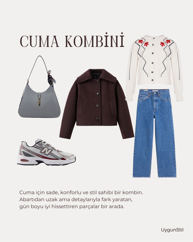 Detaylarla öne çıkan, gün boyu konfor sağlayan bir kombin. Ofiste, kahve molasında ya da şehirde uzun bir günde kurtarıcı parçalar bir arada.