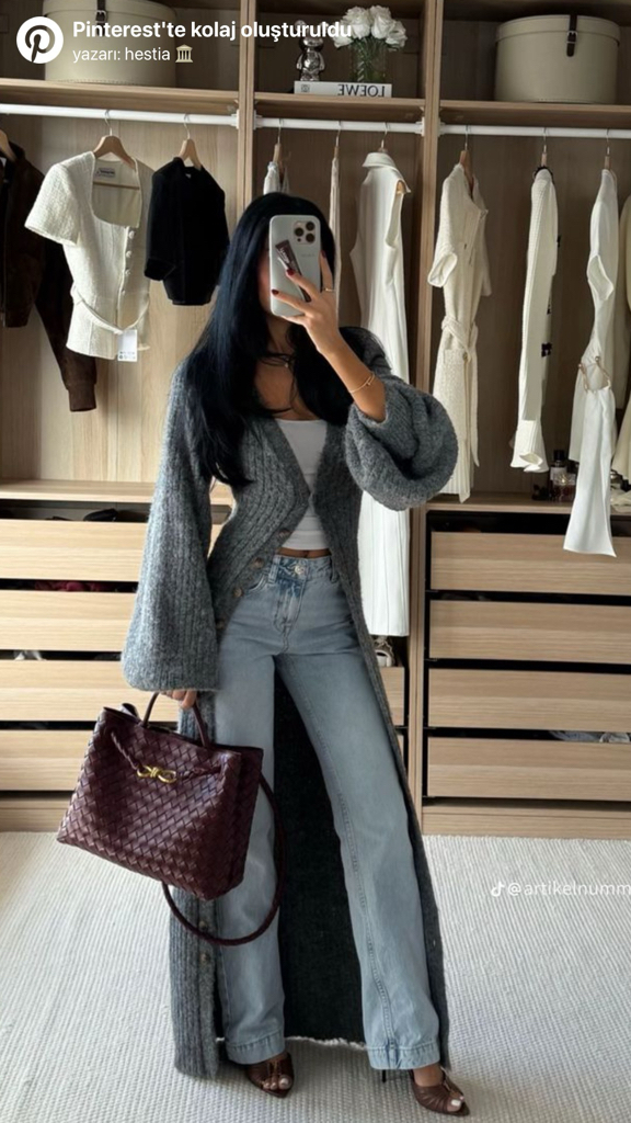 Zahmetsiz şıklığın manifestosu diyebilir miyiz peki ? Uzun triko hırkalar ve denim uyumunu, bordo detaylarlar ♥️