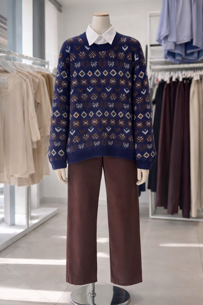 Soğuk havalar için hem rahat hem şık bir kombin. Desenli triko kazak, basic beyaz gömlekle tamamlandı. Bol kesim pantolon ve kahverengi botlarla günlük kullanıma uygun, zamansız bir stil sunar. Ofis, okul ve günlük kombinler için ideal.
