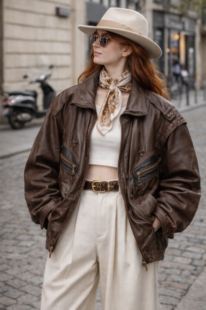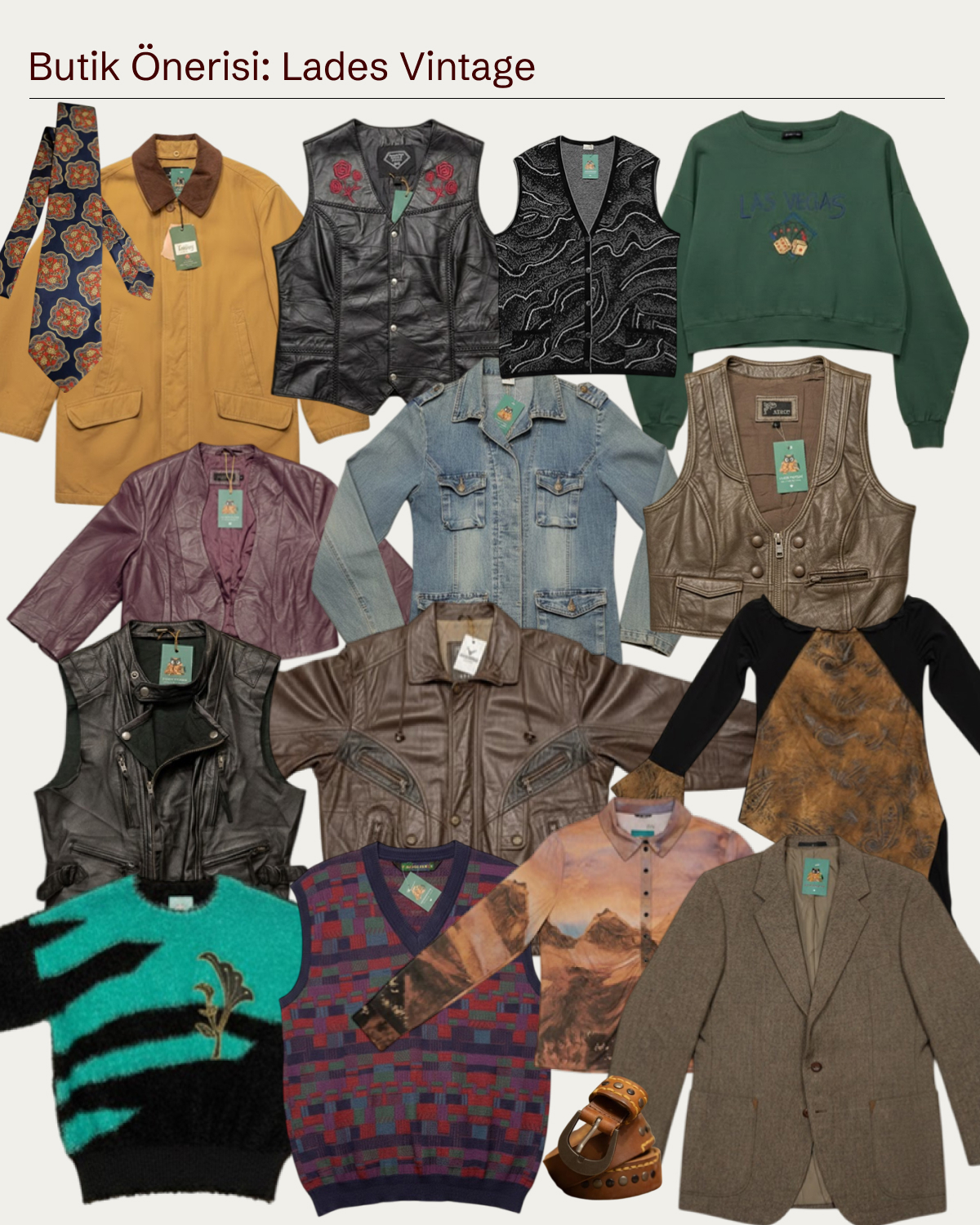 Daha maskülen ve gündelik vintage sevenler için. Deri yelekler, oversize ceketler ve 90’lar dokusunu taşıyan parçalarla Lades Vintage; cool, zahmetsiz ve sokak stiline yakın bir çizgide ilerliyor.