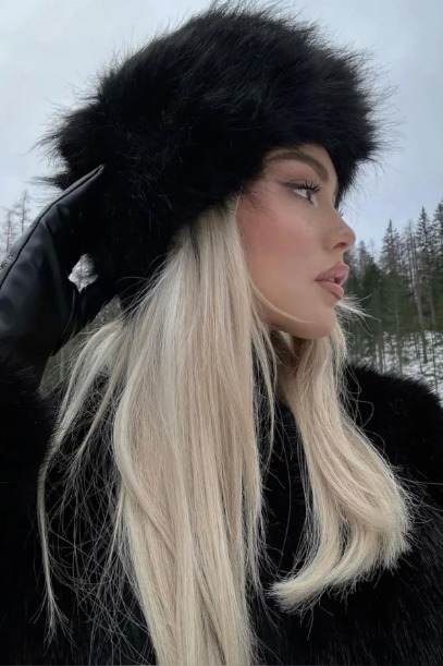 Hacimli ve yoğun dokulu siyah kürk mont, maksimalist estetiğin merkezinde yer alıyor; abartılı formu ve güçlü siluetiyle dikkat çekiyor. Uzun, dökümlü siyah etek katmanlı bir hareket hissi yaratırken, kalın tabanlı siyah platform botlar kombine ağırlık ve sertlik katıyor. Siyah kürk şapka, görünümü daha da dramatikleştirerek retro ve teatral bir hava veriyor. Monokrom siyah renk paleti, farklı dokuların çarpışmasıyla zenginleşiyor.
