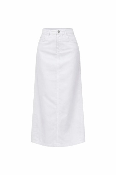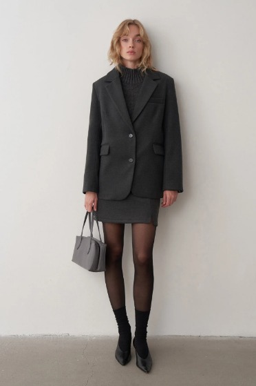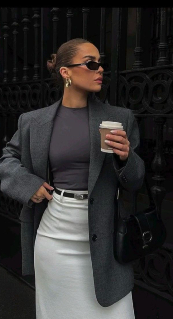 Maskülen kesim gri bir blazer ile zarif beyaz eteği birleştiren bu kombin; güçlü, profesyonel ve son derece sofistike bir şehir stilini temsil ediyor.