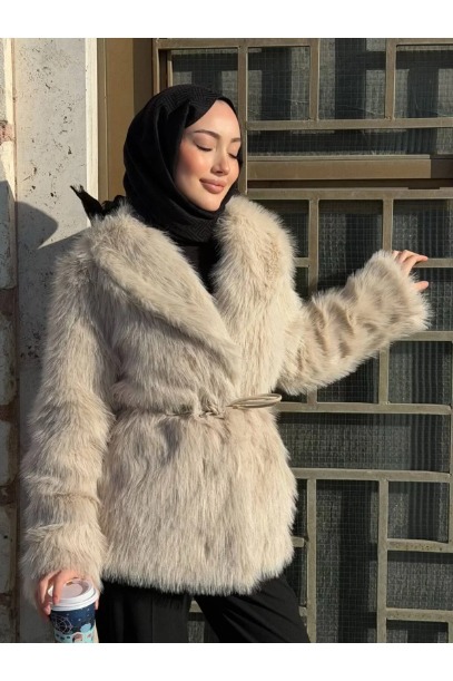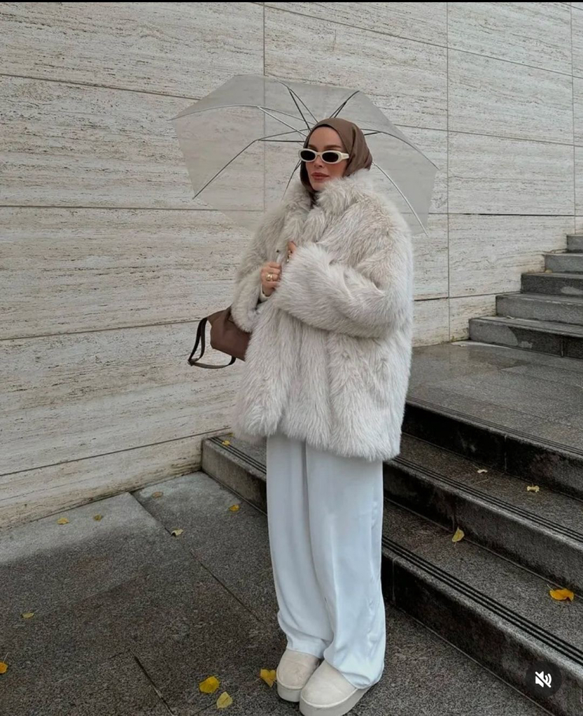 Günlük okul hayatına uygun, rahat ve şık bir kombin: açık renk oversize suni kürk ceket, bol kesim düz ya da geniş paça eşofman, konforlu ve sıcak ayakkabılar. Minimal çapraz çanta, sade aksesuarlar. Rahat, zahmetsiz bir stil; campus life için uygun, modest ve temiz bir siluet.