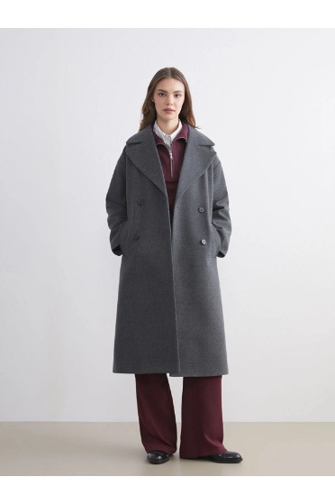 Grinin monokrom gücünü maksi boy bir palto ve heykelsi bir etekle birleştiren bu görünüm, keskin hatları ve minimal aksesuarlarıyla modern bir metropol zırhını andıran kusursuz bir zarafet sunuyor.