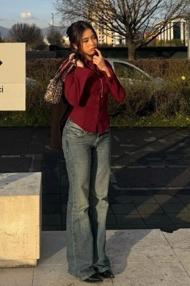 Bele oturan bordo gömlek