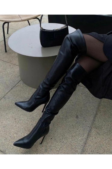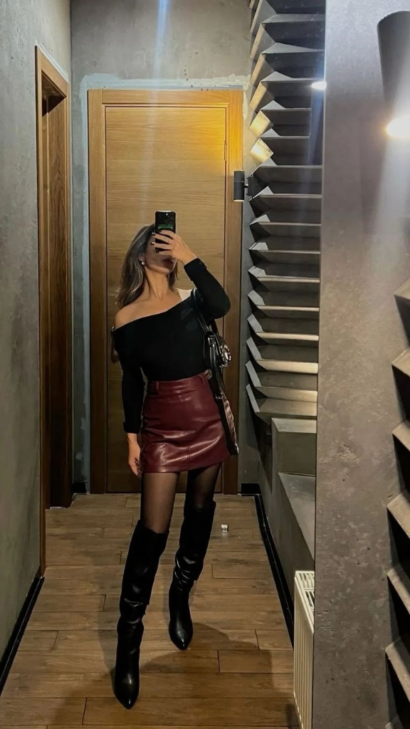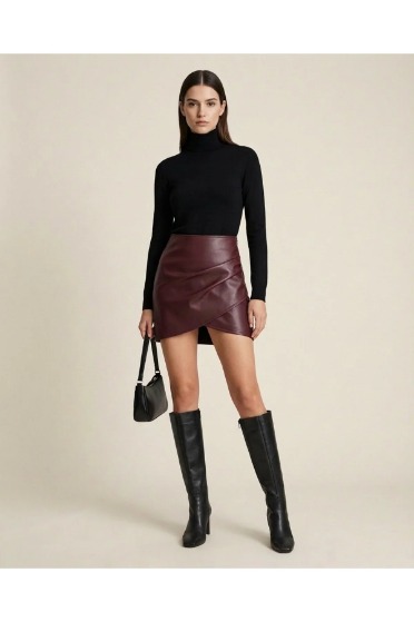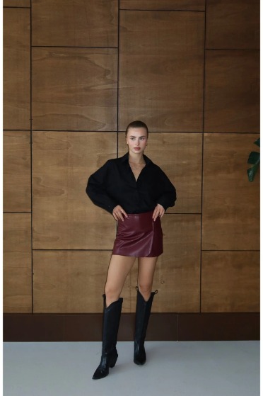 Bordo deri etek ve siyah Madonna yaka bluzla oluşturulmuş, feminen ve şık bir kombin.