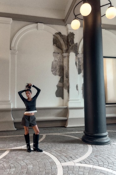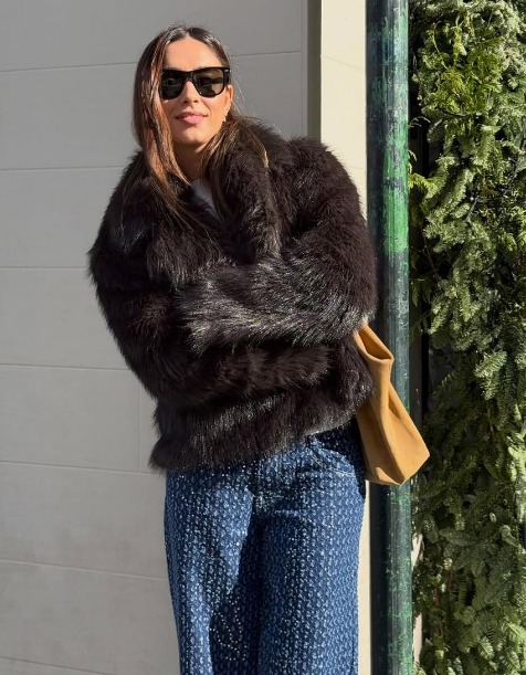 Şık ve iddialı bir akşam yemeği stili. Siyah kürk ceketle dramatik ve lüks bir siluet; içinde transparan siyah üst ile feminen ve cesur bir dokunuş. Siyah deri mini şort ve ince siyah çoraplarla dengelenmiş modern bir akşam görünümü. Diz altı siyah çizmelerle uzayan bacak hattı. Altın tonlu aksesuarlar, minimal makyaj ve dağınık düz saçlarla ‘effortless glamour’. Klasik bir mekânda, loş ışıklar altında, sofistike ama cool bir gece estetiği.