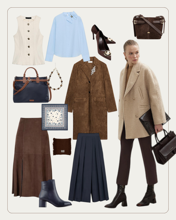 Lacivert, kahve ve açık mavi tonlarının bir araya geldiği, dengeli ve zamansız bir seçki. Parçalar kendi başına sade ama birlikte durduğunda güçlü bir şıklık yaratıyor. Günlük hayatta kolayca kullanılabilecek, abartısız ama özenli kombinler için hazırlandı. Şıklığın çabasız göründüğü listelerden biri.
