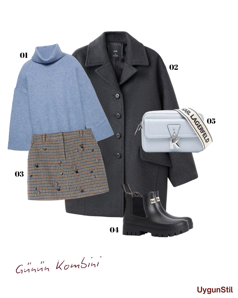 Pastel mavi kazak + ekose mini etek ile yumuşak ama güçlü bir stil 🤍 Mango’nun klasik kabanı ve Barbour botlarla gün boyu konfor, Karl Lagerfeld çantayla ise kombin bir anda “city chic” oluyor ✨