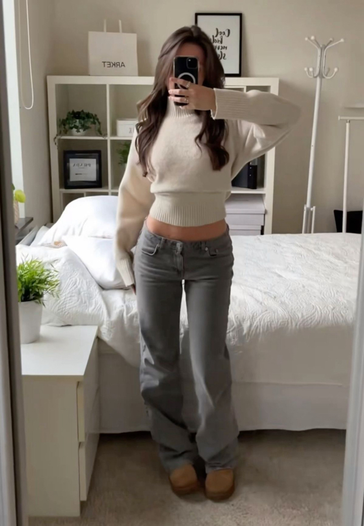 Sonbaharın zarif tonları 🍂 Üstte beyaz kazak, altta gri İspanyol paça ile sade ama şık bir kombin