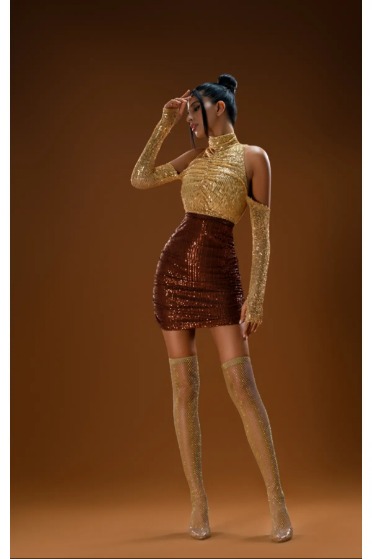 Kahve Gold Payetli Mini Elbise