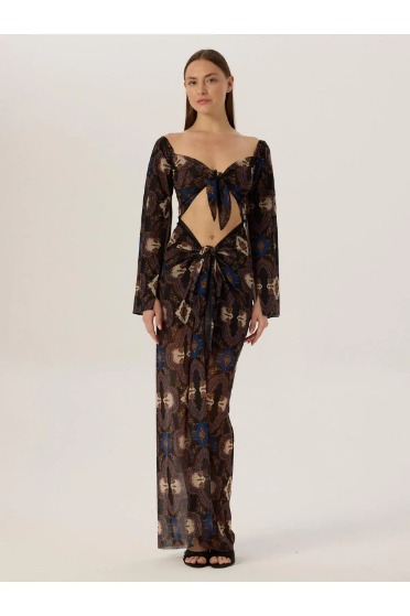 Mavi Baskılı Yırtmaçlı Elbise