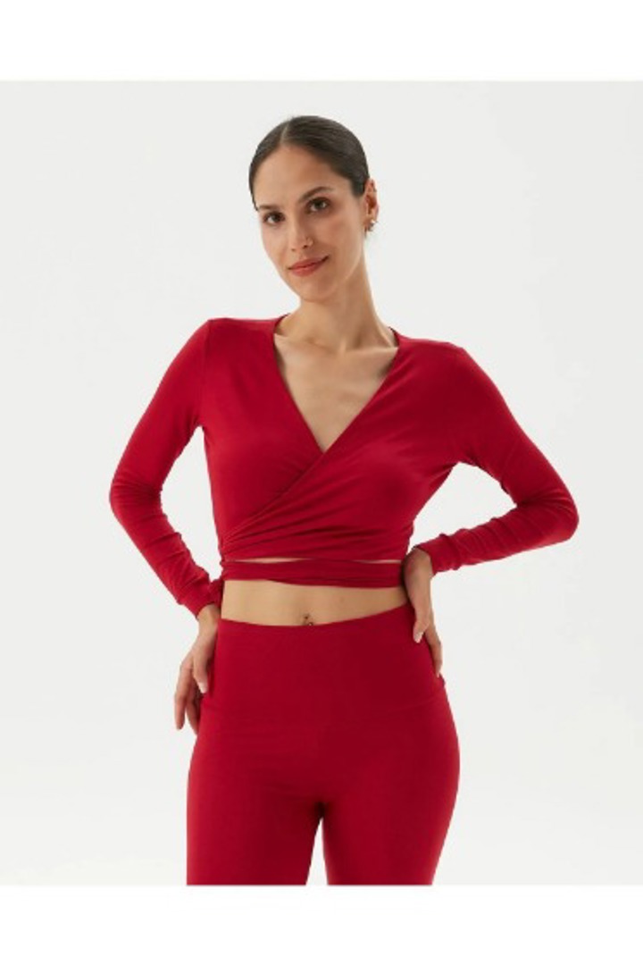 Kırmızı Anvelop belden bağlamalı crop bluz