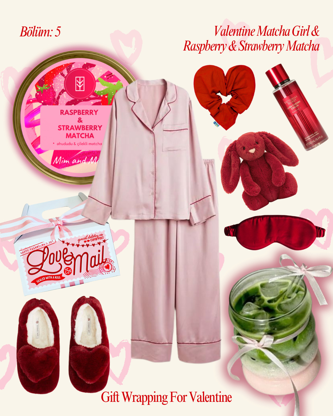 Valentine Matcha Girl, Raspberry & Strawberry Matcha’nın meyvemsi enerjisini pembe ipeğin yumuşak dokusuyla evdeki hazırlık anlarına taşıyor. Saten pijama takımının konforu, kalpli terlikler ve kırmızı detayların tatlı heyecanıyla birleşerek hediye paketleme ritüelini masalsı bir havaya bürüyor. İnce düşünülmüş her detayın zarafeti ve tavşan figürünün samimiyetiyle tamamlanan bu stil, sevginin en saf halini temsil eder. Meyveli her yudum, Sevgililer Günü hazırlığının o huzur dolu ruhunu tazeler.