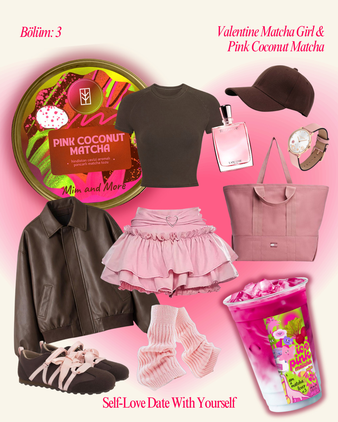Valentine Matcha Girl, Pink Coconut Matcha’nın egzotik ferahlığını kahverengi ve pembenin kusursuz uyumuyla bir şehre dönüş hikayesine taşıyor. Kahverengi deri ceketin asi duruşu, pembe tonların yumuşak enerjisiyle birleşerek kendiyle randevuya çıkan kadının özgür ruhunu yansıtıyor. Konforlu siluetler, kasket ve pembe aksesuarların dinamik şıklığıyla tamamlanan bu stil, kendine ayrılan vaktin değerini temsil eder. Hindistan cevizi notalı her bir yudum, bu modern akşamüstünün de neşesini tazeler.