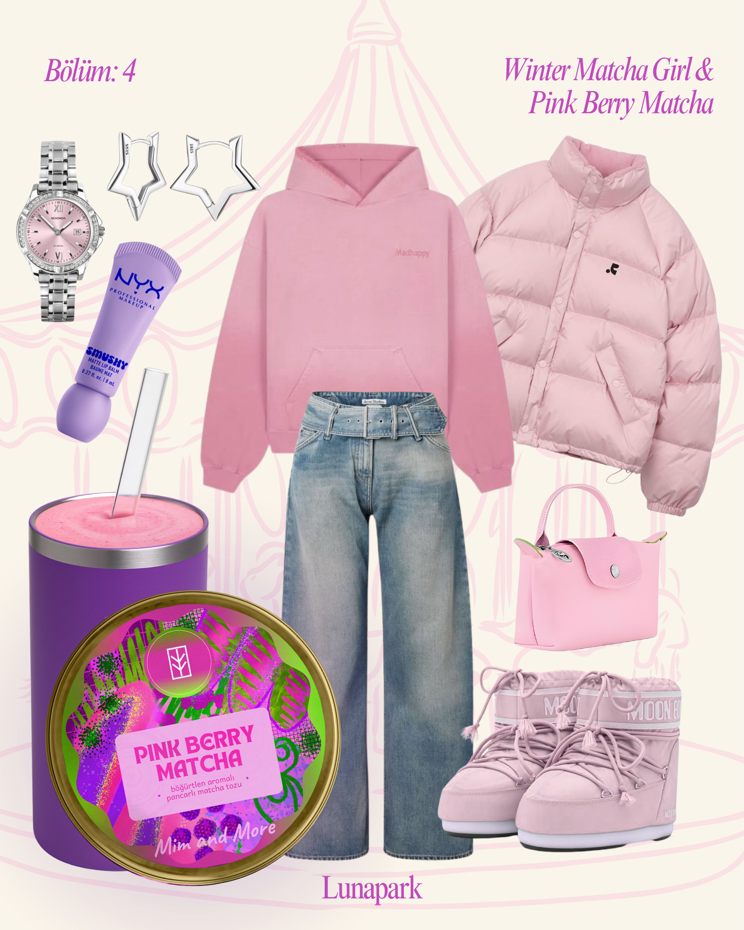 Winter Matcha Girl, lunaparkın çocukluğuna dönüştüren anı. Pembe tonlar ve denimle rahat bir oyun hâli yaratırken, hareket eden ışıklar ve gülüşler anı canlı tutar. Elindeki Pink Berry Matcha, kışın ağırlığını dağıtırken meyve notaları ve matcha'nın dengesi, neşeyi merkezde tutar. Plansız, içten ve hafifçe pembe bir mutluluk.